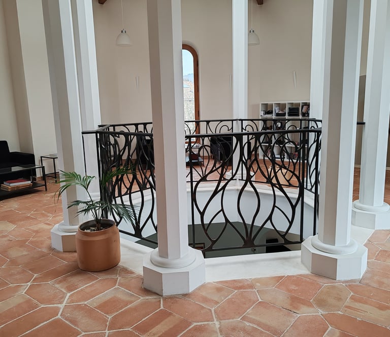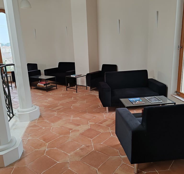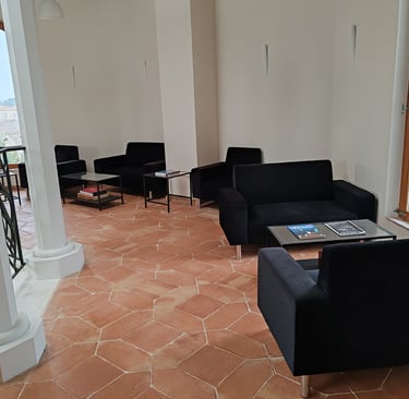 Espace de travail de 70 m² au-dessus du séjour (canapés, tables et chaises