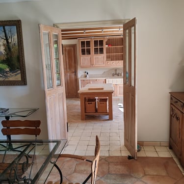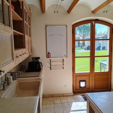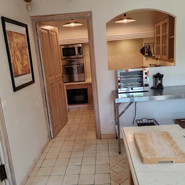 6 feux vitrocéramiques, 3 fours, 2 réfrigérateurs dont 1 américain, accès direct à la salle à manger et à la terrasse