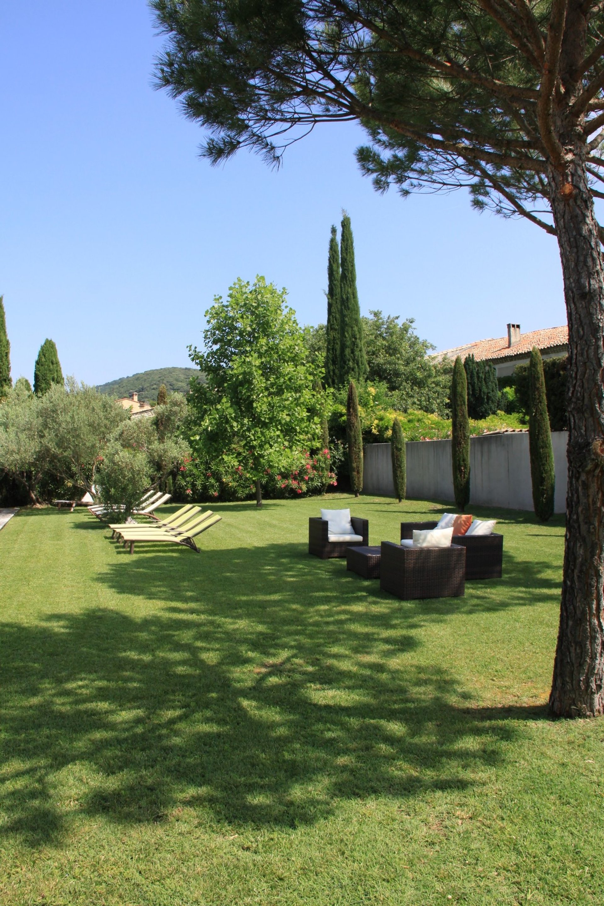 Hautes haies de lauriers roses, pin méditéranéens, oliviers...